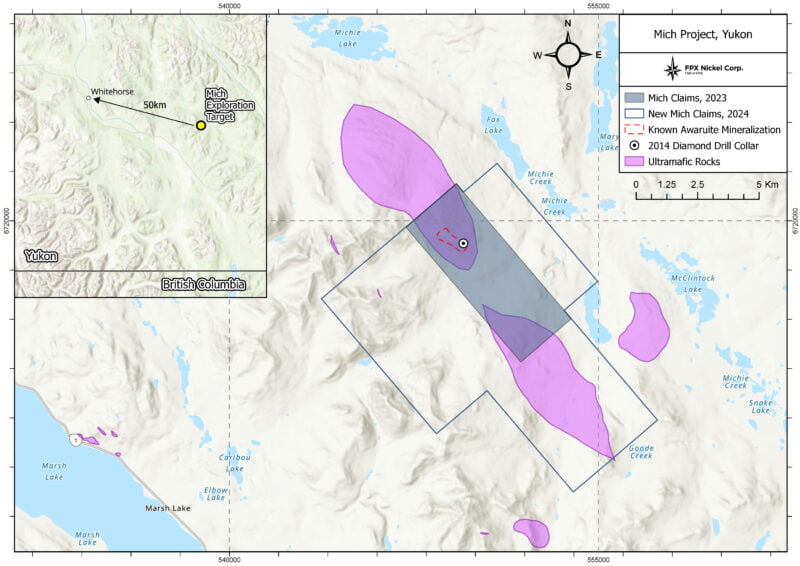 Vancouver, June 10, 2024 – FPX Nickel Corp. (TSX-V: FPX, OTCQB: FPOCF) (“FPX” or the “Company”) is pleased to announce the re-initiation of exploration activities at the Company’s Mich property (“Mich”), located 50 km southeast of Whitehorse in the Yukon.  The Company has recently expanded its claims at Mich by over 350% and will conduct a wide-ranging surface sampling program over the summer of 2024 with the goal of advancing Mich to drill-ready status.