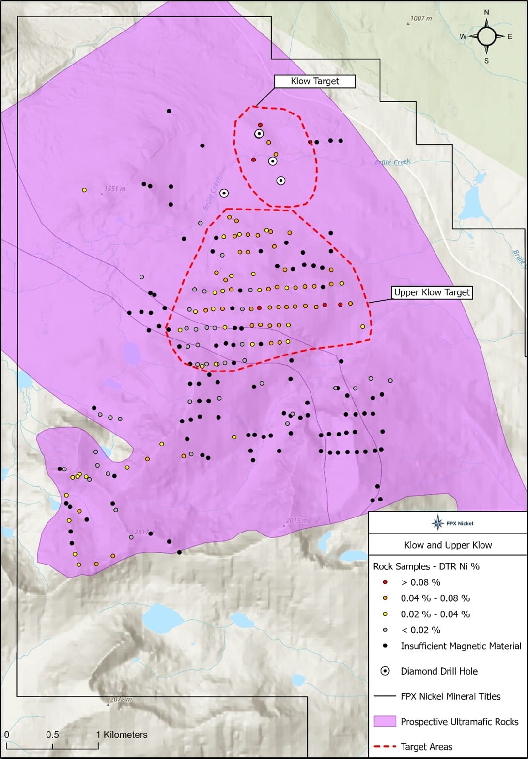 Vancouver, March 26, 2026 – FPX Nickel Corp. (TSX-V: FPX, OTCQB: FPOCF) (“FPX” or the “Company”) is pleased to announce the results from a large-scale rock and stream sediment sampling program at the Company’s Klow property (“Klow” or the “Property”), located 45 km north of the Company’s Baptiste Nickel Project. Three new awaruite target zones were delineated through reconnaissance rock sampling in 2025 with Davis Tube Recoverable (“DTR”) nickel values of up to 0.09%. Work was 100% funded by the Japan Organization for Metals and Energy Security (“JOGMEC”) under the terms of an earn-in agreement which provides JOGMEC the option to earn up to a 60% interest in the Property.