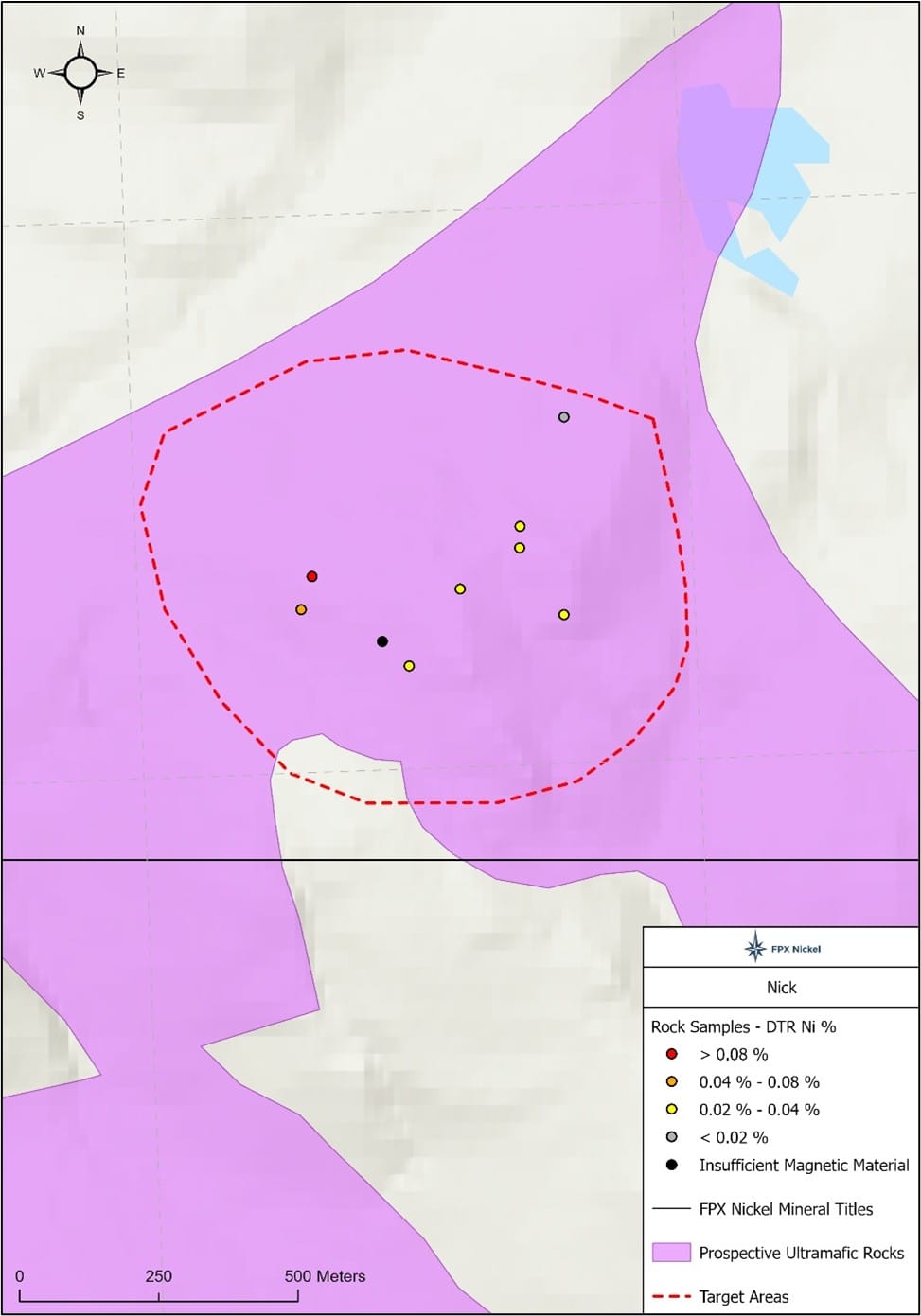 The Nick target area is located in the south of the Klow claim group. Only limited work was completed here in 2025 but encouraging DTR nickel values of up to 0.08% were received from rock sampling (figure 4). This area will be a target for future follow-up sampling and delineation efforts.