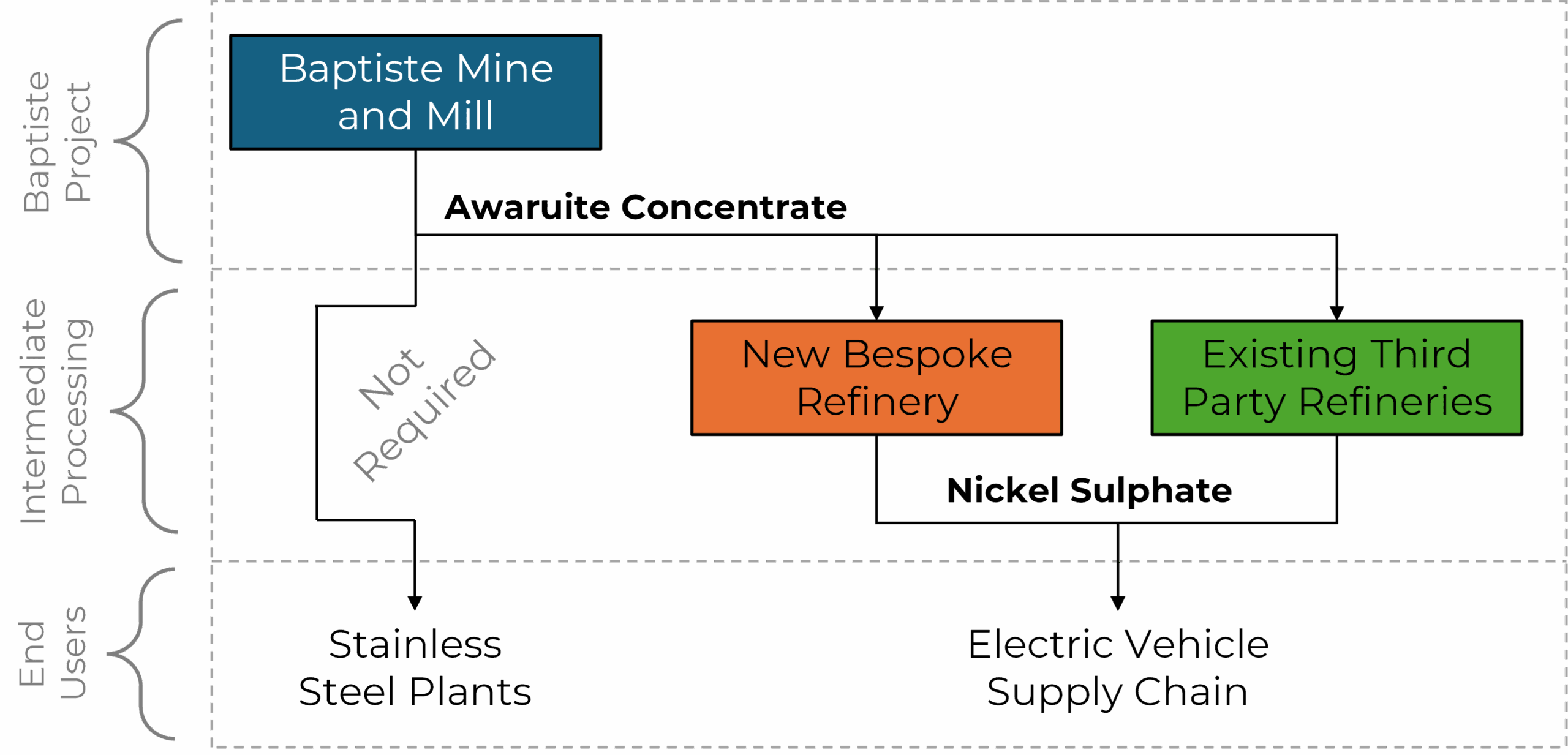 A second integration route is for the Baptiste awaruite concentrate to be refined in an existing third-party nickel refinery. Although nickel refineries are generally sensitive to variations in feedstocks, awaruite concentrate can be used to supplement a portion of the feedstock, particularly for nickel refineries designed to treat both mixed hydroxide precipitate (“MHP”) and nickel matte — the two most commonly interchangeable nickel intermediates. Awaruite concentrate has properties that position it between MHP and matte — with fewer impurities than MHP but more than matte, and requiring less aggressive leaching than matte but more than MHP — making it broadly comparable to both and a credible feedstock for nickel refineries. The production of bulk quantities of awaruite concentrate will enable this strategy to be validated by prospective downstream partners through direct testing of awaruite concentrate.