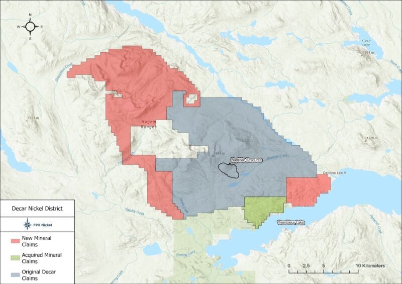 Vancouver, October 29, 2024 – FPX Nickel Corp. (TSX-V: FPX, OTCQB: FPOCF) (“FPX Nickel” or the “Company”) is pleased to announce an expansion that almost doubles the mineral claims package at the Baptiste Nickel Project (“Baptiste” or the “Project”), located within the Company’s wholly-owned Decar Nickel District (“Decar”). The total area of the Decar claims package is now approximately 451 km2, providing several benefits to the development of Baptiste, including geological potential, project development flexibility, and simplification of the regional engagement landscape.