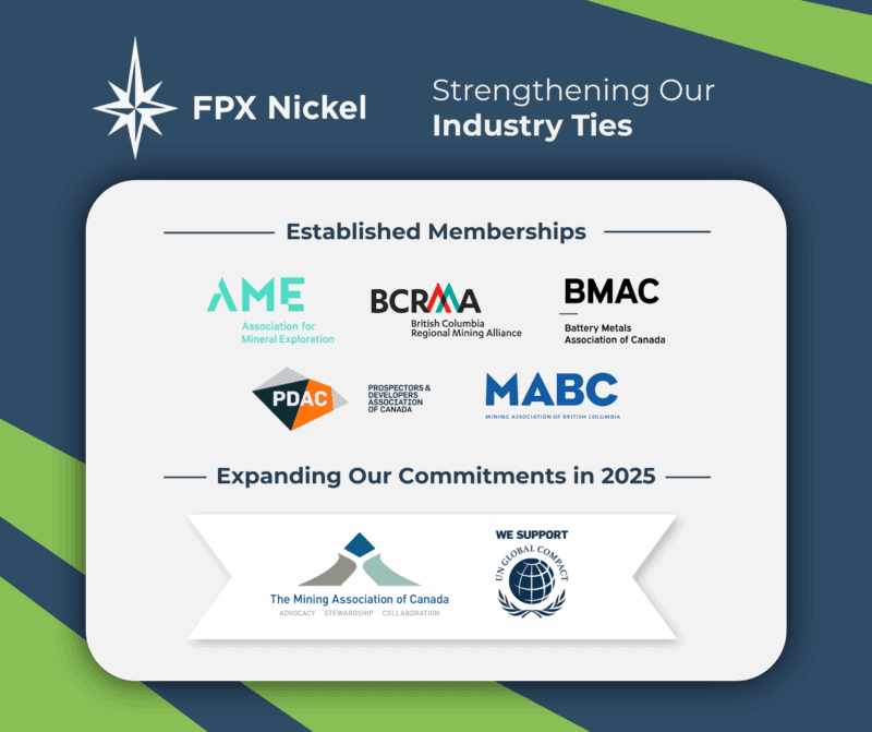 Vancouver, August 21, 2025 – FPX Nickel Corp. (TSX-V: FPX, OTCQB: FPOCF) (“FPX” or the “Company”) is pleased to announce its participation in two leading sustainability initiatives in 2025, reinforcing our commitment to responsible mineral exploration and project development. These initiatives include the Company’s new membership in the Mining Association of Canada (“MAC”) and associated commitment with MAC’s Towards Sustainable Mining program for exploration-stage companies, and participation in the United Nations Global Compact.