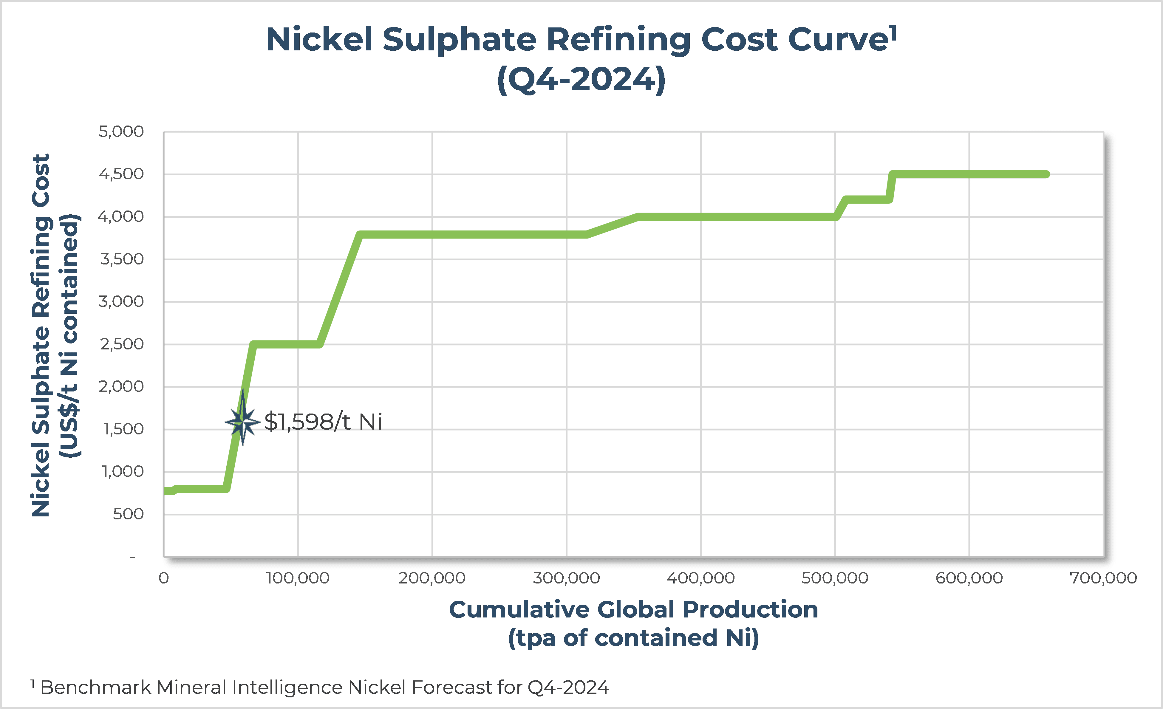 The Refinery’s operating costs excluding byproduct credits ($1,598 /t nickel contained) would fall within the lowest decile of global production as per Benchmark Mineral Intelligence’s (“Benchmark”) nickel sulphate cost model, as presented in Figure 1. When byproduct credits are included, the Refinery would have a lower production cost that any current global producer.