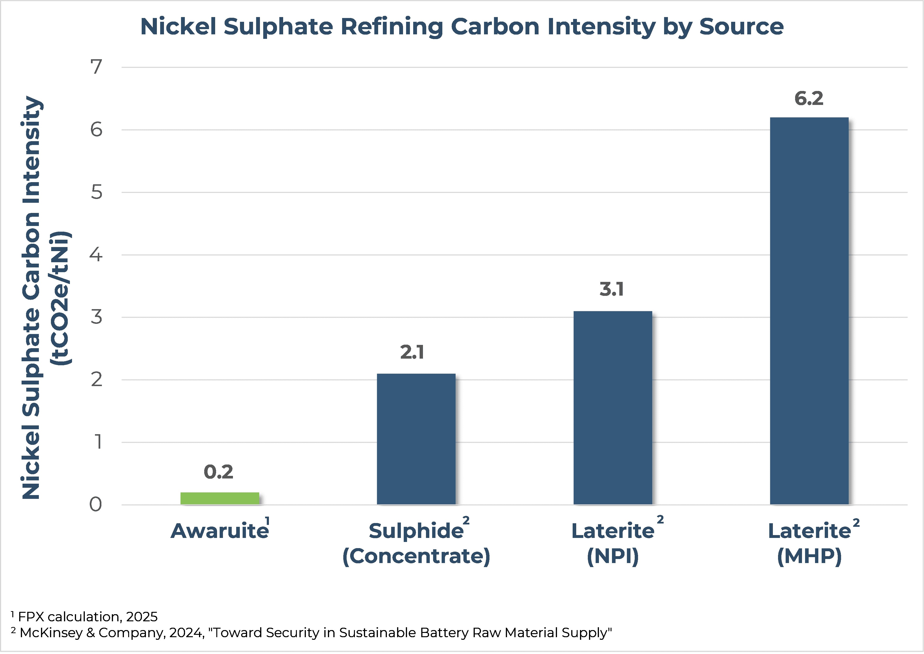 The Refinery will be supplied with low-carbon power from the BC Hydro grid, resulting in a carbon intensity of 0.2 t CO2/tNi. As presented in Figure 2, this is magnitudes lower than current nickel sulphate production routes.