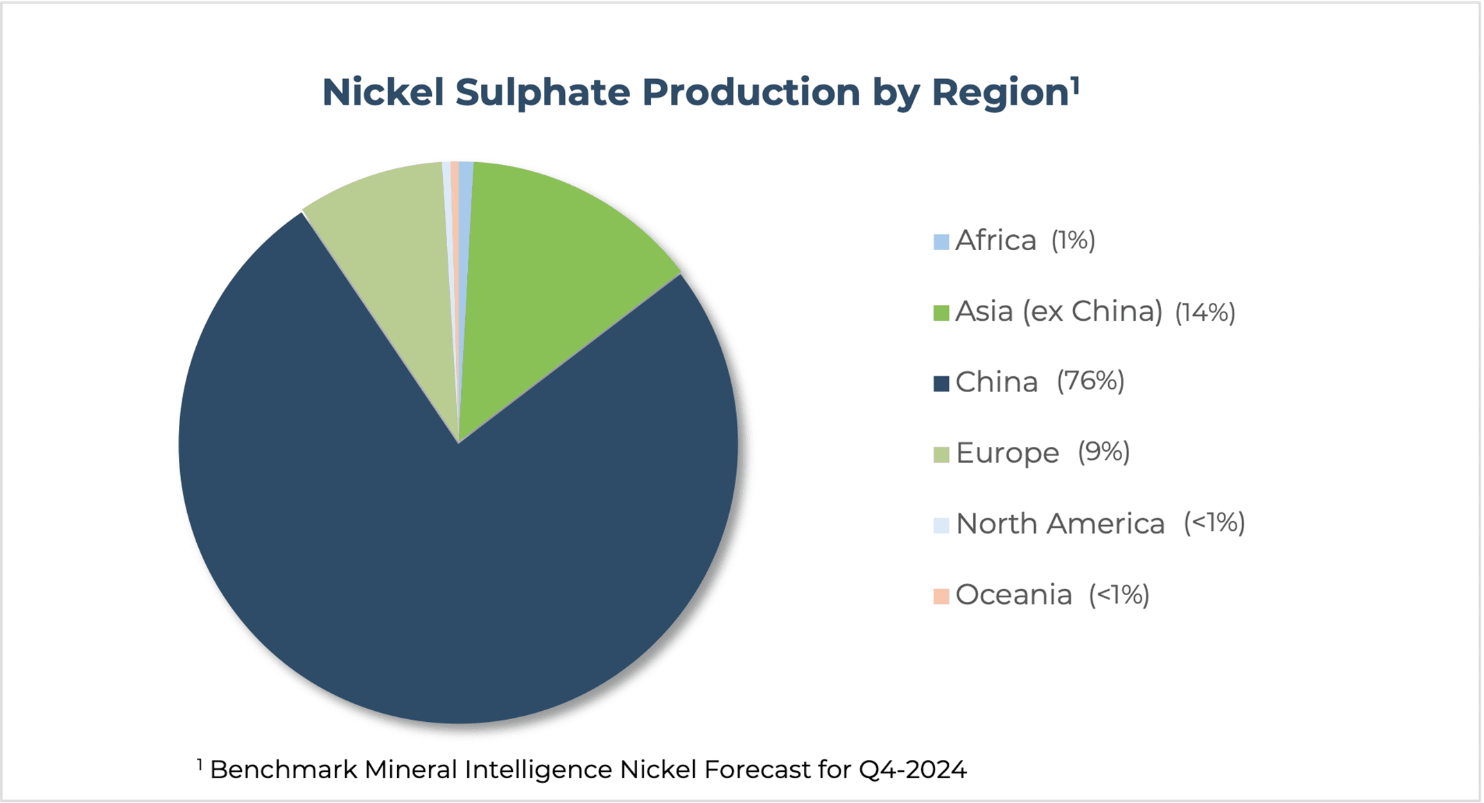 According to Benchmark’s database, the 2024 annualized nickel sulphate production market size was approximately 657,000 tonnes per year of contained nickel as of the fourth quarter of 2024, with production heavily dominated by China at 76%, as presented in Figure 4. Additionally, less than 1% of current nickel sulphate production is North American (3,300 tonnes per year of contained nickel). As such, the 32,000 tonnes per year of high-quality nickel sulphate produced by the Refinery in Canada would represent an approximate tenfold increase in current North American nickel sulphate production.