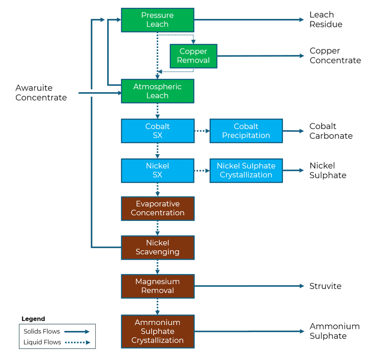 The metallurgical testwork program involved multiple bench- and a pilot-scale campaigns (see FPX news release dated October 15, 2024). The latest testwork campaign involved continuous pilot-scale testing of leaching unit operations and confirmed the leaching flowsheet. Nickel leach extractions greater than 99% and production of low-impurity leach solution, suitable for downstream purification and crystallization, were simultaneously achieved during piloting. In addition, bench-scale testing of solution purification and crystallization unit operations demonstrated the ability to produce battery-grade nickel sulphate crystals using the new ammonia-based flowsheet. Incorporating testwork results, the refining strategy takes advantage of awaruite’s characteristics in a simple flowsheet utilizing well proven unit operations, as presented in Figure 5.